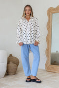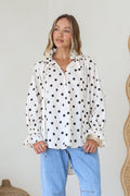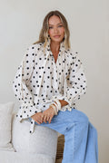 Meet your new go-to blouse! The Sally Shirt features a charming polka dot pattern that's impossible to resist. Tie up the collar for a flirty, adjustable fit that works with your vibe, while the elastic wrist bands create a playful flare at the cuffs. Perfect for dressing up casual days or adding personality to your everyday wardrobe. This versatile piece transitions seamlessly from brunch to evening plans.