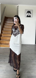 Flirt with versatility in our Part Time Lover Skirt—a satin stunner that transitions seamlessly from day to night. The rich chocolate and cream palette pairs beautifully with a sultry black lace panel that hugs the hemline, adding just the right amount of edge. Dress it up with heels and a silky top for evening allure, or keep it casual with sneakers and a tee for effortless weekend vibes. This skirt is your new go-to for looking polished without trying too hard.